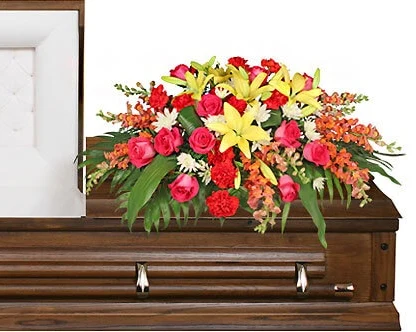 Express your deepest sympathies with the In Loving Memory yellow and red funeral casket flowers. Adorn the casket with this elegant arrangement, honoring the life and memories of your loved one in a striking and meaningful way.